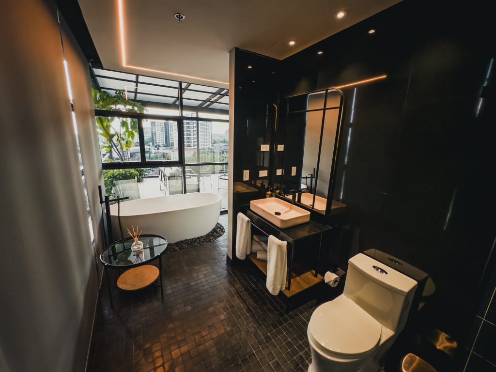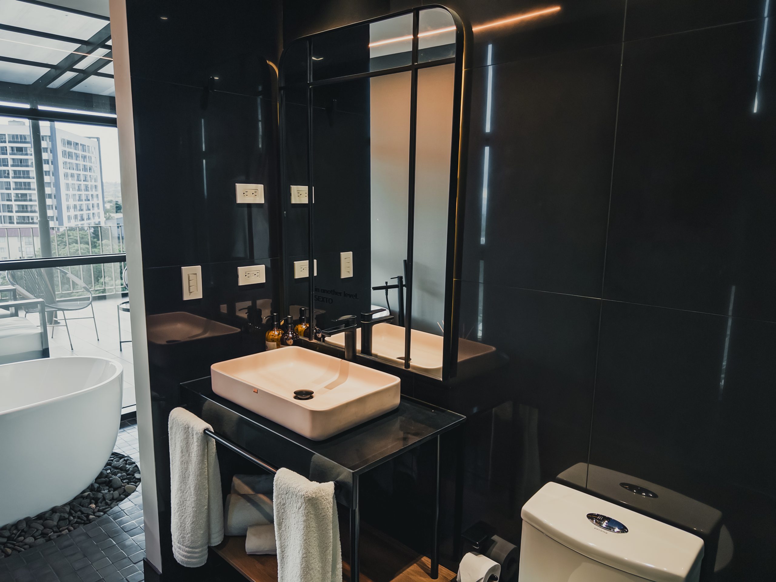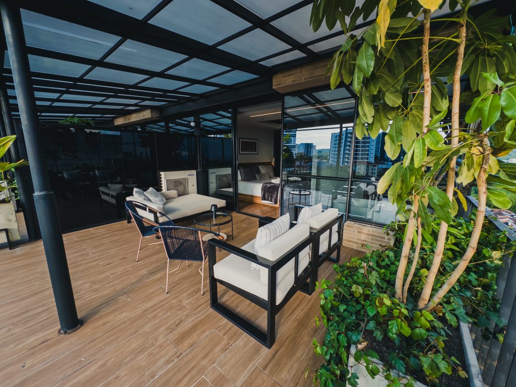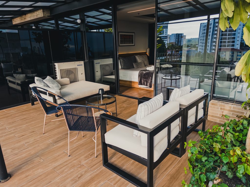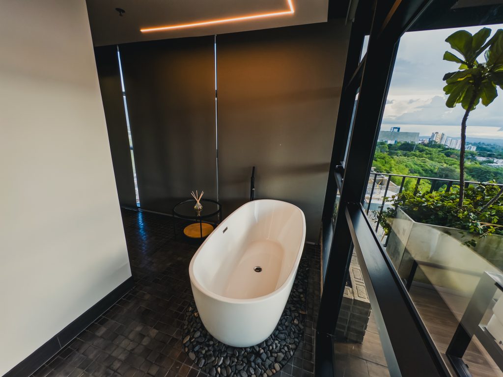 Habitaciones con Tina exterior, balcón o terraza y con vista a la cordillera y a la reserva natural, estilo contemporáneo, amenidades de lujo, lencería 1000 hilos, cortinas automatizadas, ventanas contra ruido.